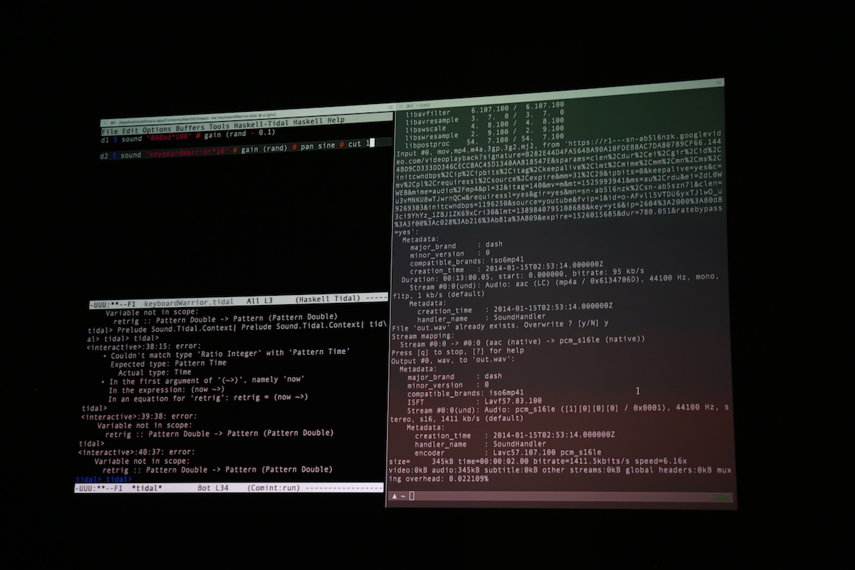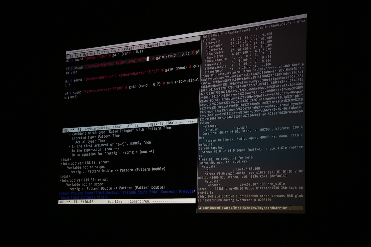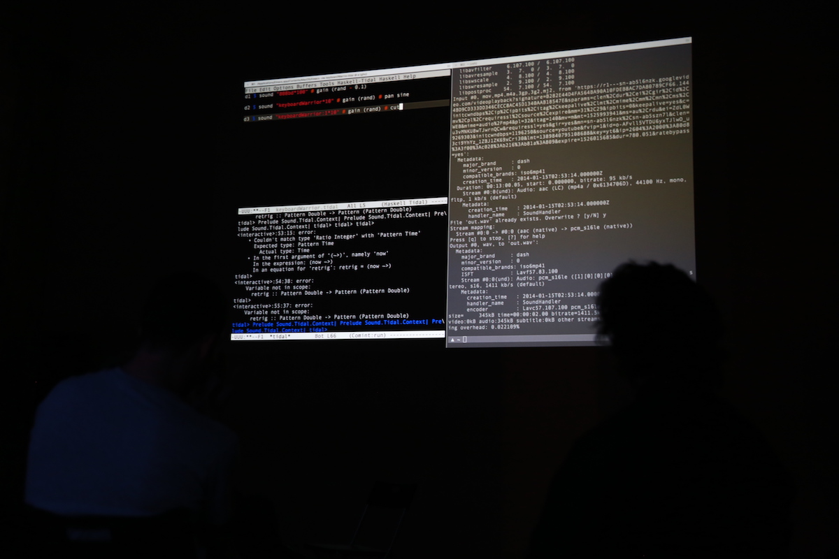 The live-coding is done in TidalCycles, a Haskell-based textual language for synthesizing and sequencing
